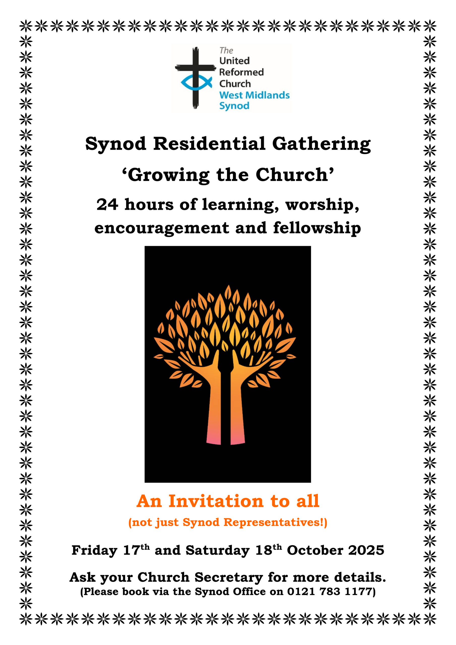 In October 2025, we hold a residential gathering which is open to anyone in the West Midlands with an interest in or commitment to the United Reformed Church. There will be an additional business meeting for Synod Representatives on Thursday 23 October via Zoom.