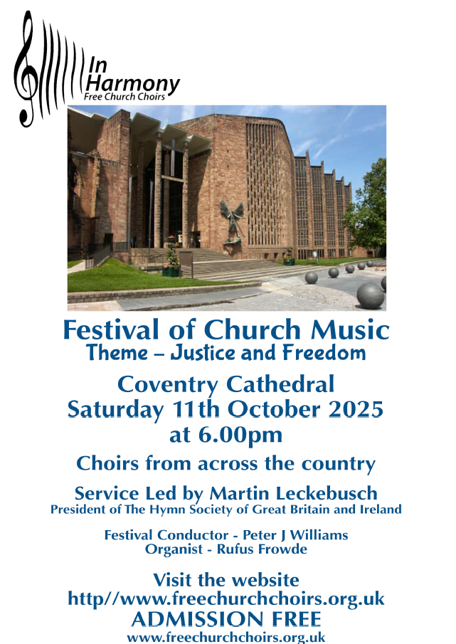 Free Church Choirs holds a biennial Festival of Church Music usually in a cathedral or other large place of worship and an article about Free Church Choirs was included in a recent edition of Reform magazine. In 2025 the Festival will be held in Coventry Cathedral. The Festival brings together singers from all over the UK and is open to all who love singing.
