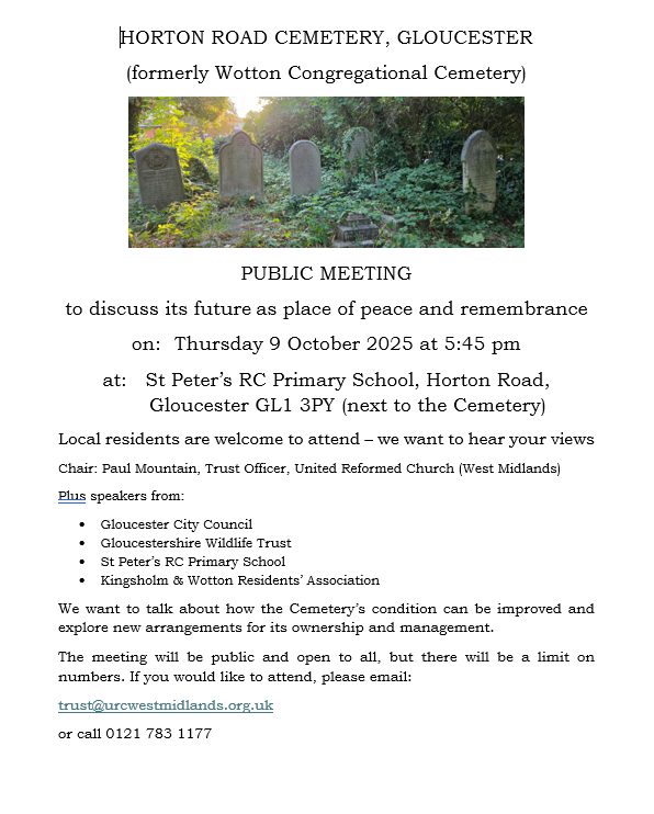 The Legal and Trust Officer of the URC West Midlands Synod, is organising and chairing a public meeting to discuss the future of Horton Road cemetery (formerly Wooton Congregational cemetery.) This will take place on Thursday 9 October 2025 at St Peter’s RC Primary School, 5:45pm. The URC are looking to explore new arrangements for its ownership and management.